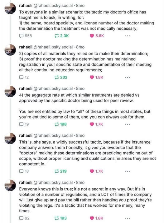 Obligatory disclaimer: I am not a lawyer, medical doctor, or insurance professional. The following screenshot was shared in a private FB group. I went to the BlueSky account and it appears to be an actual account and not a bot. I cannot verify the soundness of the advice given, although it seems to align with the ProPublica information.